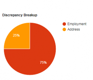 Next, let us look at the breakup of the discrepancies to identify further which types of components (checks) were the source of these discrepancies. These discrepancies were in employment verification (accounting for 75% of the total discrepancy) and address verification (accounting for 25% of the total discrepancy).